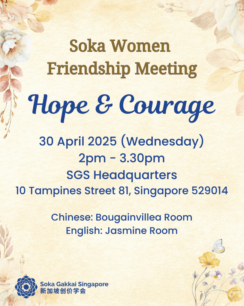 If you’ve missed the recent Friendship Meeting, you can now look forward to the Soka Women Friendship Meeting carrying the same theme, “Hope & Courage”, this April 30. Do invite a friend and come join us for this inspiring sharing soon!