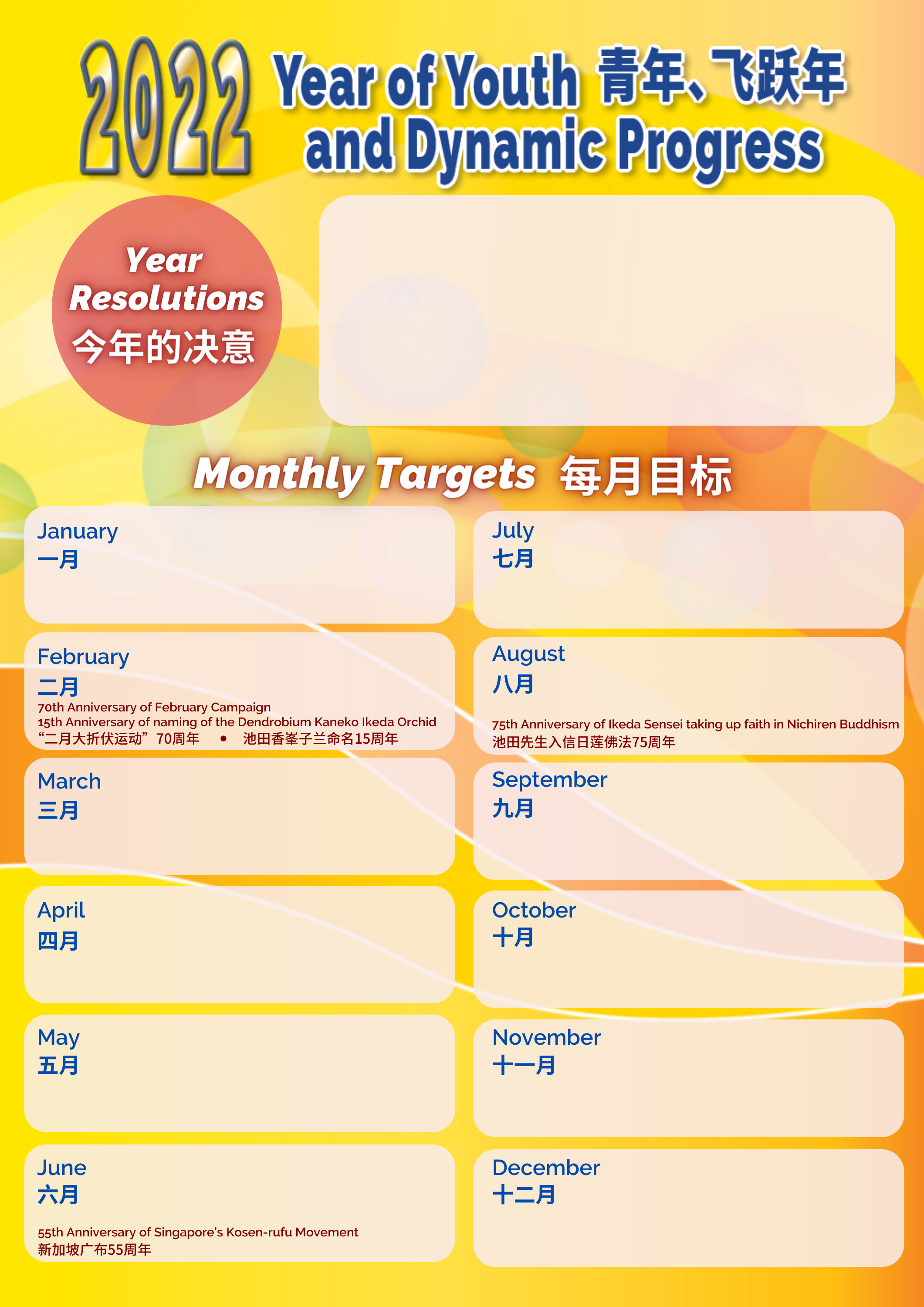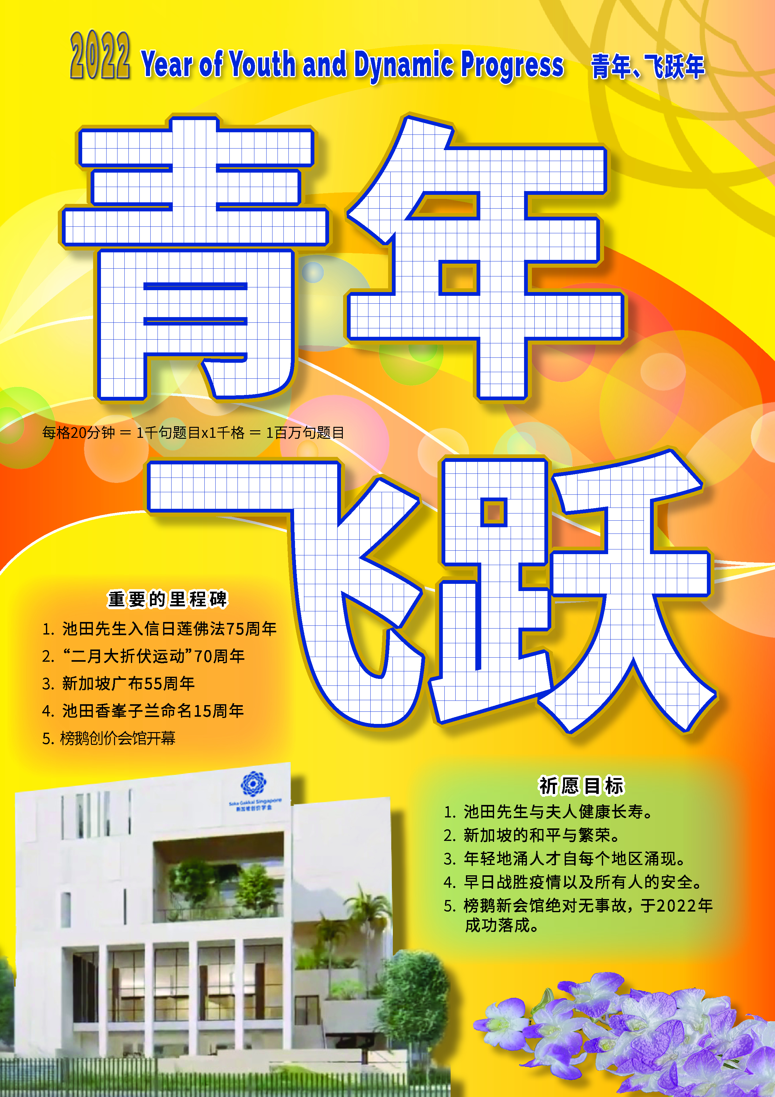 The Soka Gakkai theme for year 2022 has been declared as the ‘Year of Youth and Dynamic Progress’. To usher in this brand new hopefilled year, we have prepared a series of collectibles for everyone. Do check out the one million prayer chart, resolution card and zoom background for year 2022.